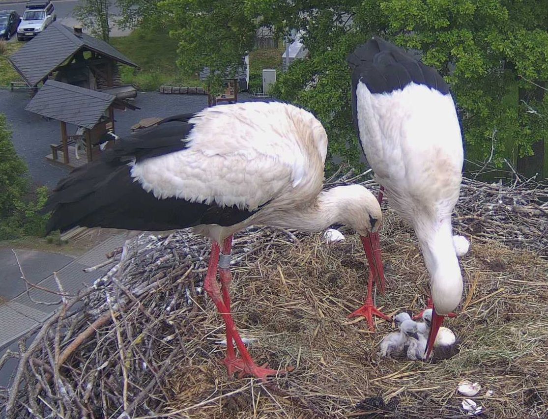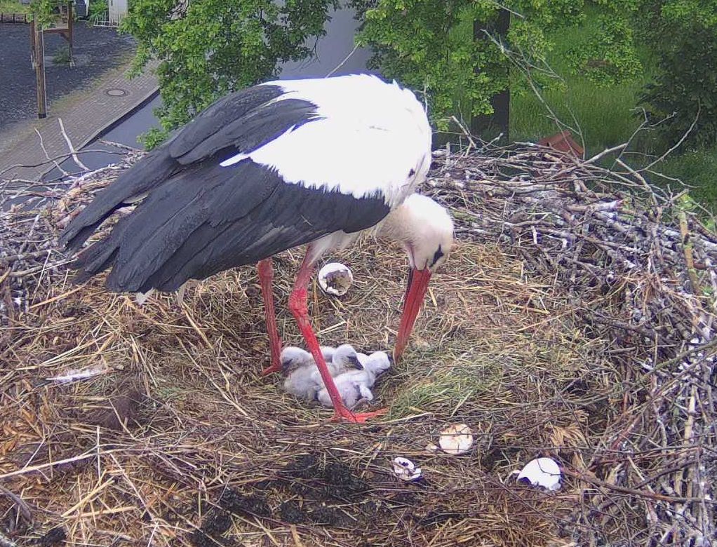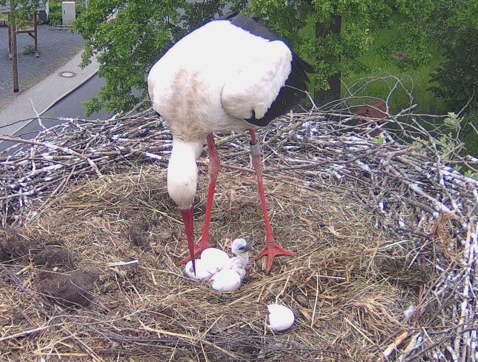 In der Zeit vom 15. bis 17. April wurde es spannend: Das Storchenpaar legte insgesamt vier Eier, die sie abwechselnd mit viel Geduld und Hingabe bebrüteten. Die Vorfreude war groß – und am 17. Mai war es endlich so weit: Das erste Küken hat das Licht der Welt erblickt. Ein besonderes Ereignis, das viele Herzen berührt.